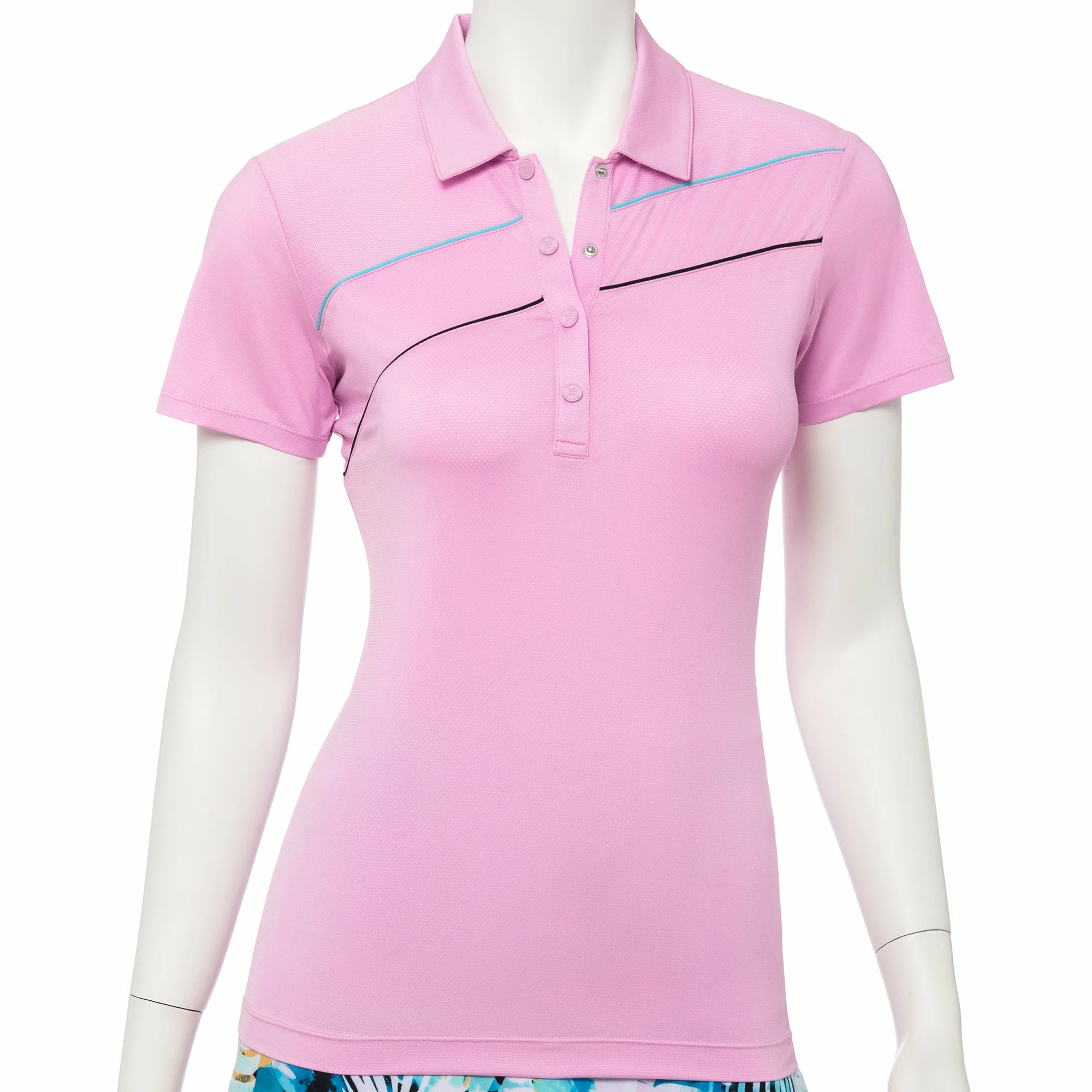 The EP NY Bora Bora Short Sleeve Curved Piping Womens Golf Polo is made from a subtle double knit pointelle fabric for great breathability and ease of movement. This polo features front and back curved contrast piping, mesh blocking on the front and back yoke, while a self fabric collar with 4-snap placket completes the look.