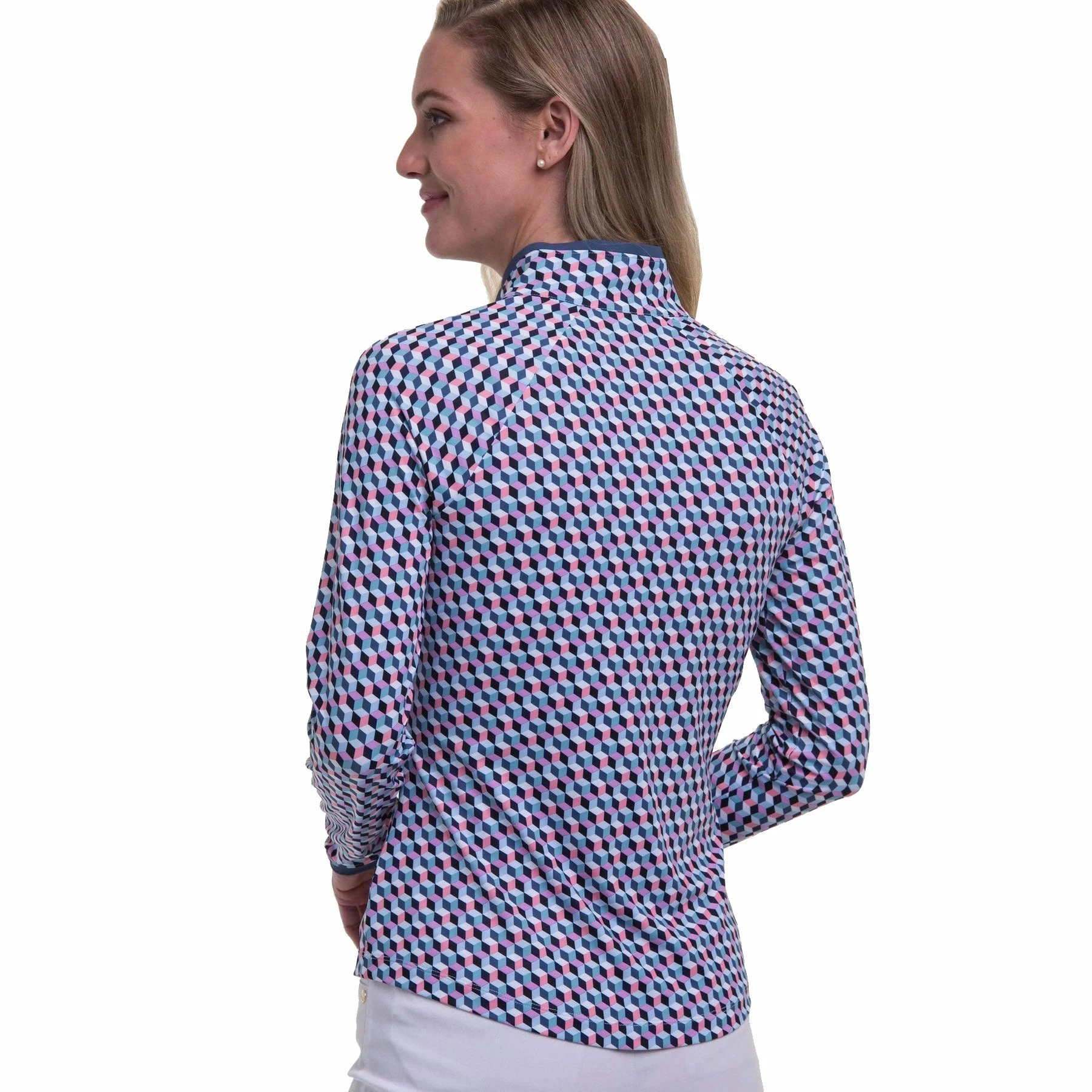 Get ready to make a statement with the Fairway & Greene Wesley Womens Long Sleeve Golf Polo. This polo is made of a polyester/spandex blend that fits comfortably on the body and wicks moisture so you stay dry and comfortable all day long. An all-over pattern, contrast inside collar and contrast cuff trim adds a touch of style to the classic polo. A zip mock neck lets you customize your coverage while UPF 50+ works to keep you protected from the sun’s harmful rays.