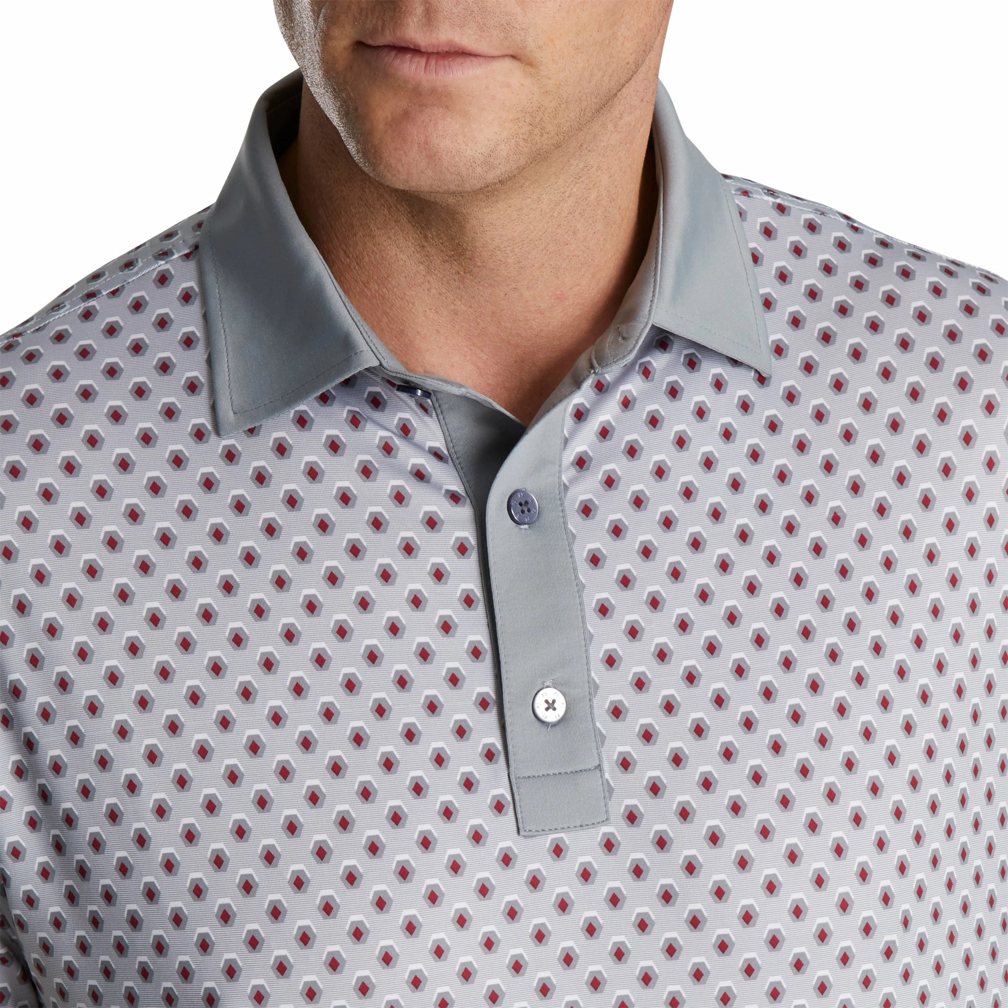Add style to your wardrobe with the FootJoy Geometric Print Lisle Golf Polo. The Geometric Print is built with the FootJoy Exclusive ProDry fabrication that provides outstanding moisture control that will wick away moisture quickly to keep you dry and comfortable throughout the round. This polo has an anti-microbial technology that prevents odor from building up to keep you smelling fresh and the double stitched seams make the Geometric Print highly durable. The contemporary color, contrast collar and pattern will have you looking good from the first tee to the final green.