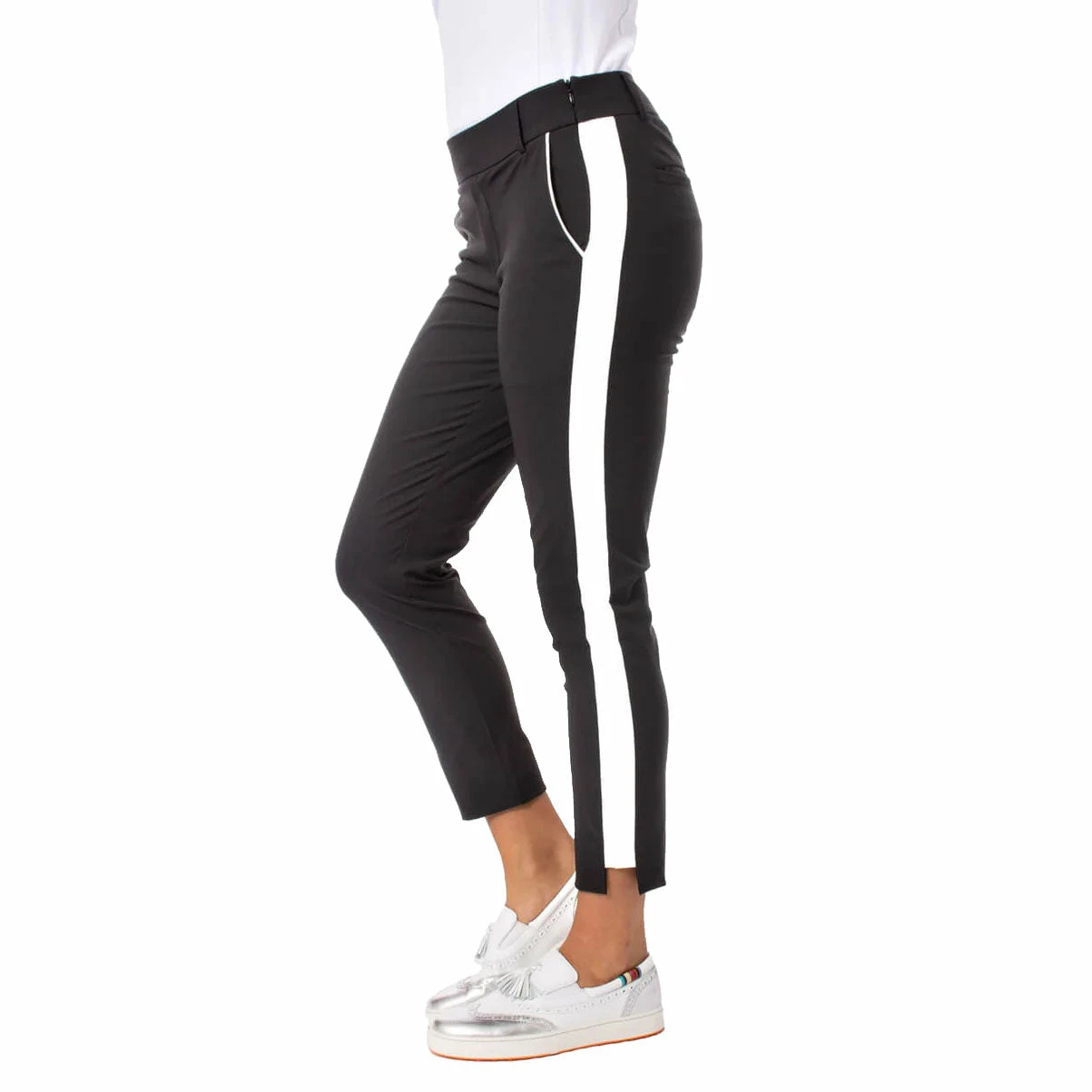 Look and feel fabulous with the Golftini Pull On Stretch Ankle Womens Golf Pants. Slide into comfort with a 2in elastic waistband and pull on styling with added zipper for ease. These pants are lightweight and certified water repellent so you stay dry during your round. Two side pockets and two back welt pockets help storage you tees and scorecard as you move from hole to hole.