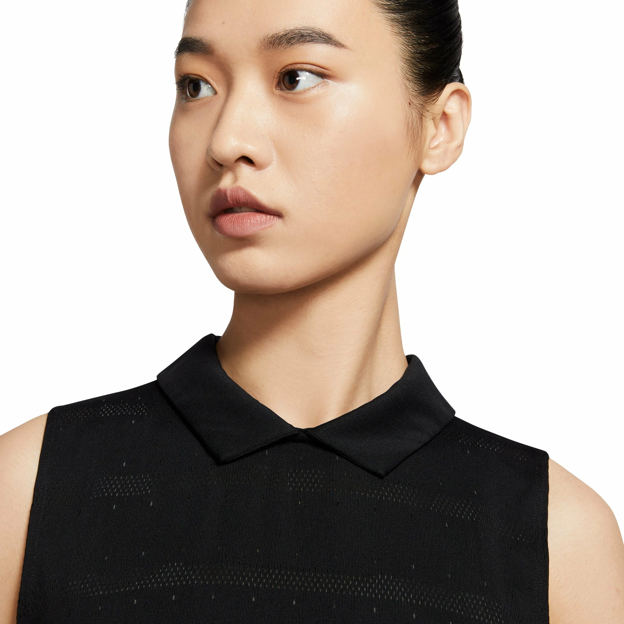 Get breathability and style for the golf course with the Nike Dri-FIT Ace Womens Golf Polo. This polo features open-hole ventilation on the back that enhances airflow while also providing an elegant look that stands out from the generic polo normally seen. The fabric soft, lightweight and stretchy and is highly breathable in high heat areas so you will stay cool and comfortable as the round heats up. The Nike Dri-FIT technology pulls moisture from the body for more comfort and the modified racerback will cover traditional bra straps.