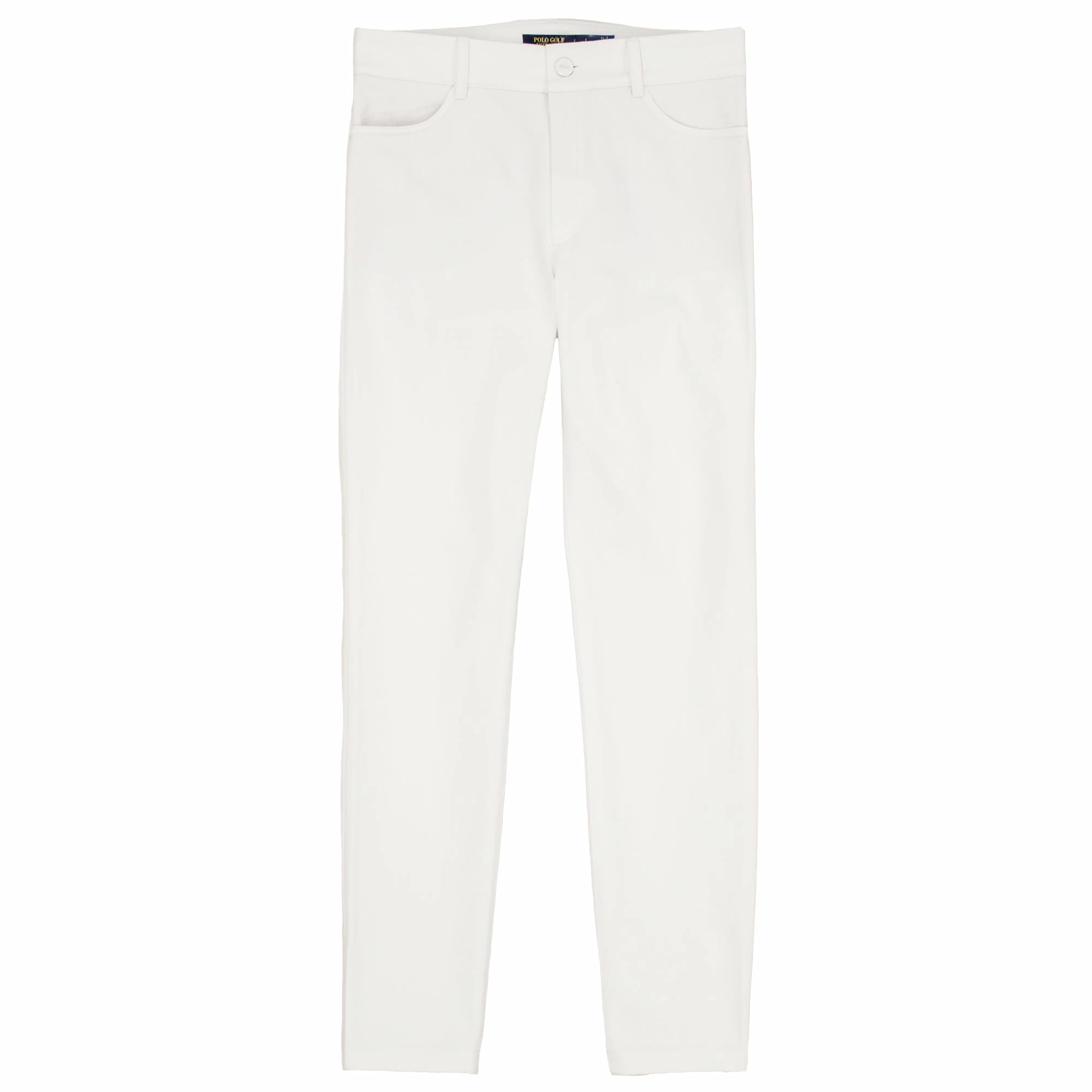 The Polo Golf Stretch Twill Womens Golf Pant combines the look of slim jeans with the comfort of super stretch twill. These slim fit golf pants are made from a soft stretch fabric for superior comfort and mobility, and feature a fly front with a signature button closure, belt loops, and two front and two back pockets.
